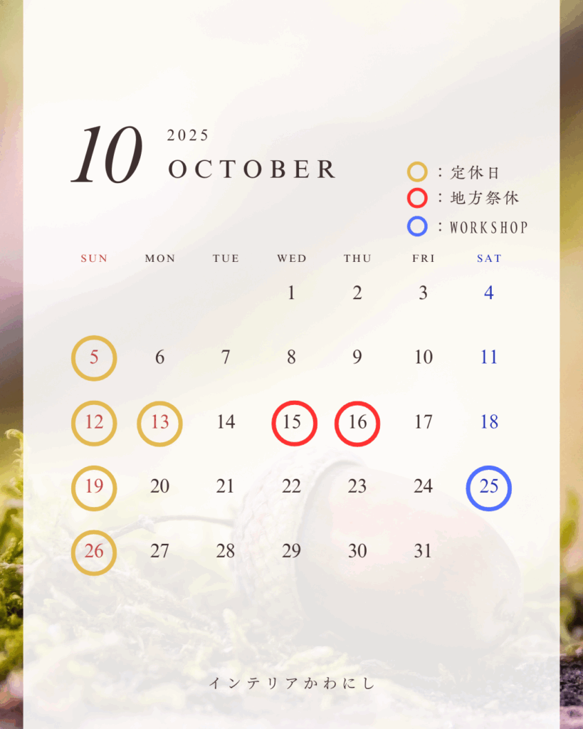10月の営業カレンダーです。 ご来店予定の方はご確認お願い致します。 10月は地方祭もございます!10/15・16はお休みをいただきます。 みなさまもご安全にお楽しみください✨ WSの詳細は決まり次第、Instagramでもでお知らせ足しますので、ぜひチェックし... -