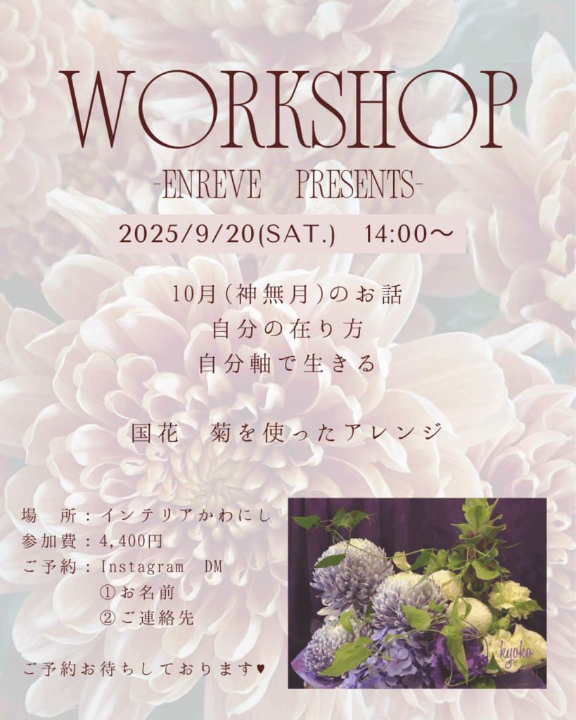 9/20(土)14:00~ インテリアかわにしで開催される菊を使ったフラワーアレンジWS byアンレーヴさん 開催が来週に迫ってきました😊 まだ枠がございますので、迷われている方はぜひご予約をおまちしております 詳しくはInstagramのピン留めしている投稿をご... -