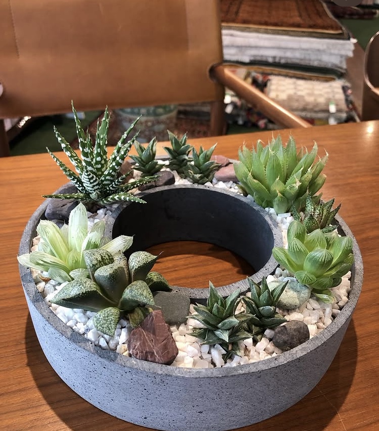 インテリアかわにしの入口にあるシンボルツリーのオリーブ・ショールームにある多肉の寄せ植えなどもまあるいばななさんのものです。