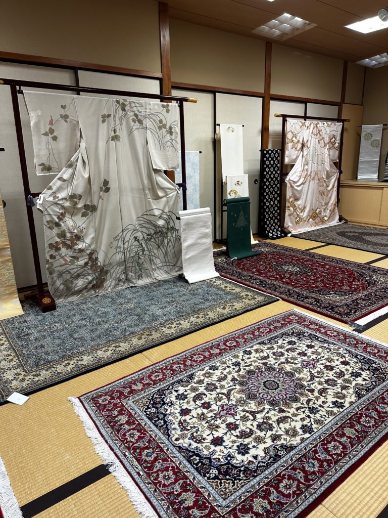 素敵なお着物とJapaneseワインに花を添える形でペルシャ絨毯を敷かせていただきました。