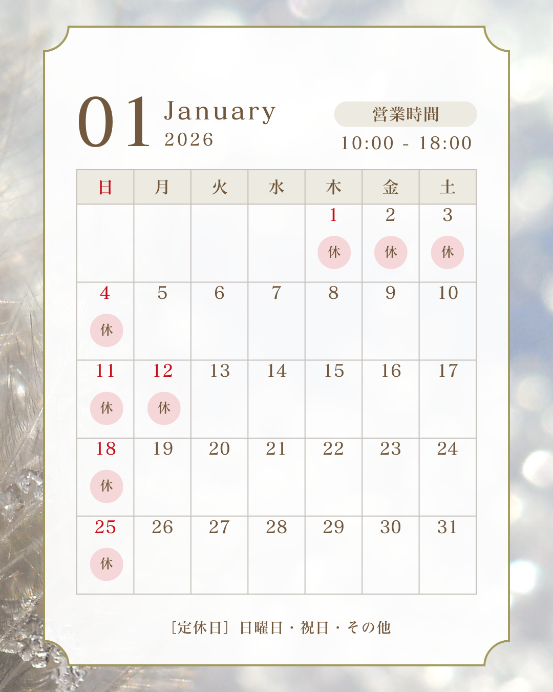 2026年1月の営業カレンダー 2025 12/19 お知らせ 2025年12月19日 2026年1月の営業カレンダーです。 以前の投稿でもお知らせしておりますが、年末年始休暇は下記となっております。 12/27(土)~1/4(日) 1/5(月)より通常営業いたします。 ※定休日は日曜日・祝日となっております。 お知らせ よかったらシェアしてね! URLをコピーしました! URLをコピーしました! 雑貨取り扱い始めました 年末年始休業のお知らせ 関連記事 ご来場ありがとうございました 2026年1月26日 シルクロード手織り絨毯展開催 2026年1月22日 2月ワークショップのお知らせ 2026年1月17日 新年のご挨拶 2026年1月5日 年末のご挨拶 2025年12月26日 年末年始休業のお知らせ 2025年12月20日 雑貨取り扱い始めました 2025年12月19日 歳末セール開催中! 2025年12月12日