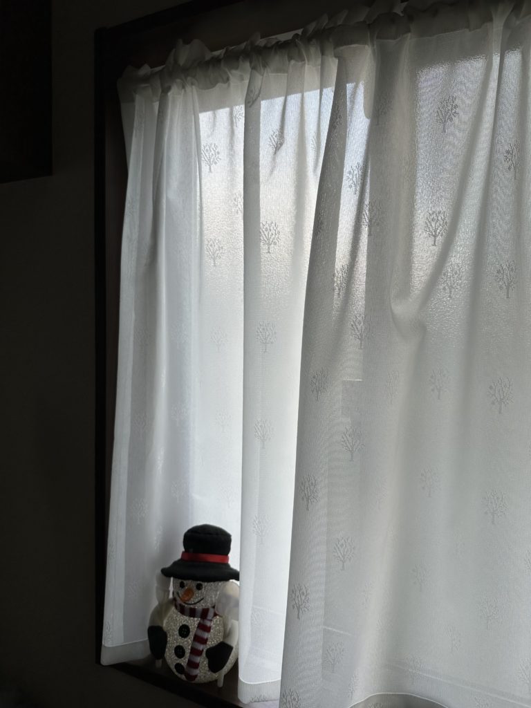 カラーのレースカーテンは難しそうですが、光が入ると明るいお色に見えるのでとても馴染みが良いです。