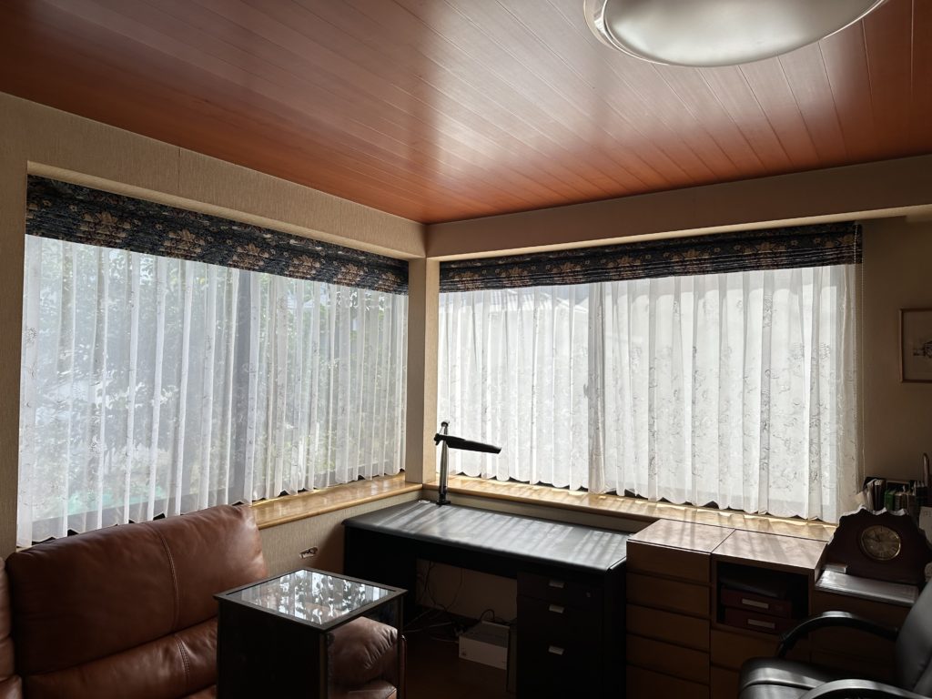 居間にあるL字型の大きな窓にモリスのレースカーテン・シェードを取りつけました。